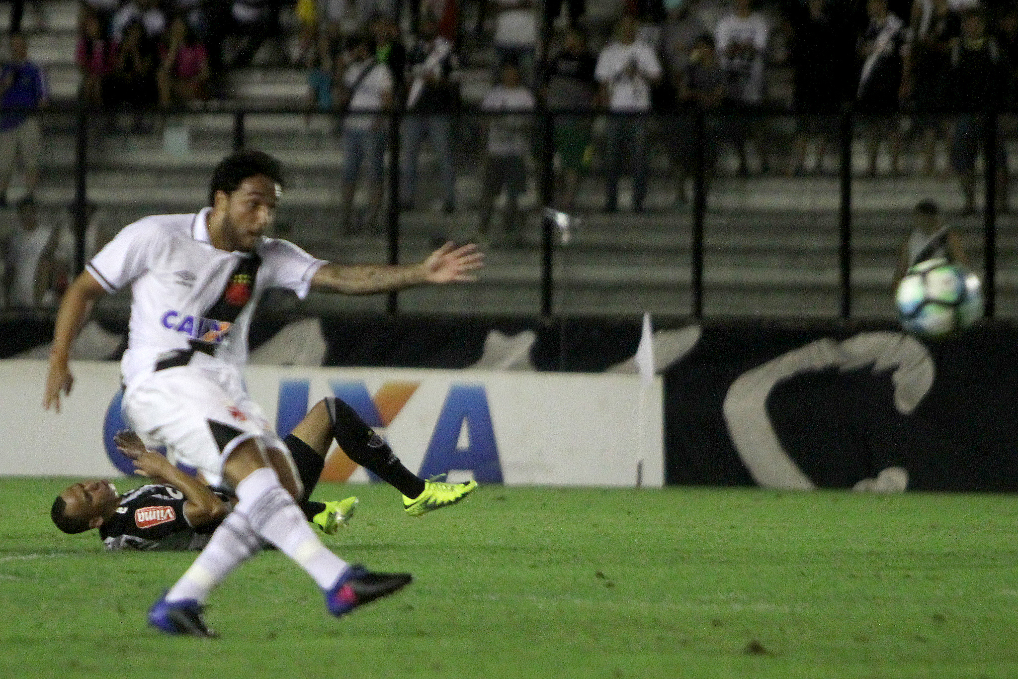 A primeira grande oportunidade foi aos 34 minutos. Voltando de lesão, o atacante Hugo Borges arriscou o chute pouco depois do meio de campo e encobriu o goleiro. Uma pintura em São Januário: VASCO 2 x 1.