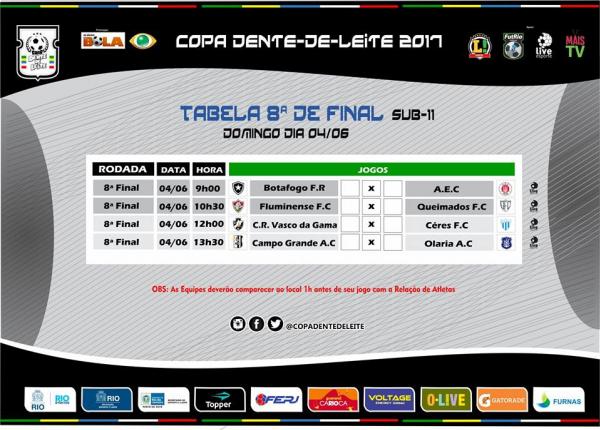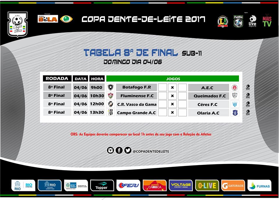 Segue a ''TABELA DAS OITAVAS DE FINAL'' da Copa Dente-de-Leite O-LIVE 2017,que acontecerá domingo dia 04/06/2017 no CETDEO - Centro de Treinamento Deodoro, localizado na Vilta Militar-RJ. ⚽🏆
