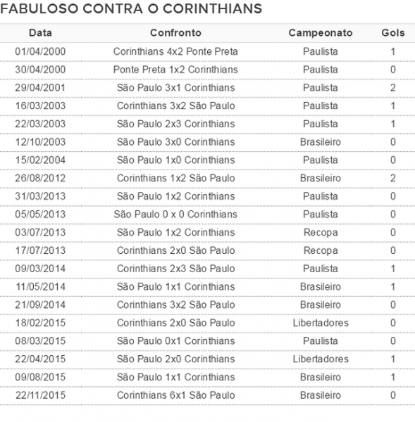 Em 20 confrontos com os corintianos até hoje, o Fabuloso marcou 11 gols - média de 0,55. Agora com a camisa cruz-maltina, ele espera manter a fama, mas melhorar o número de pontos conquistados. O jogador tem 11 derrotas, três empates e seis vitórias.