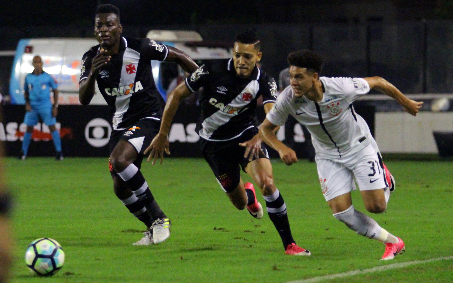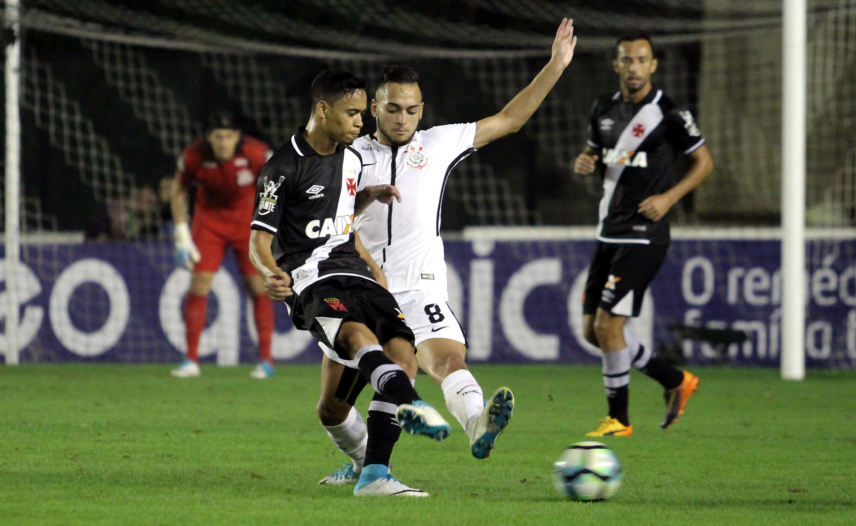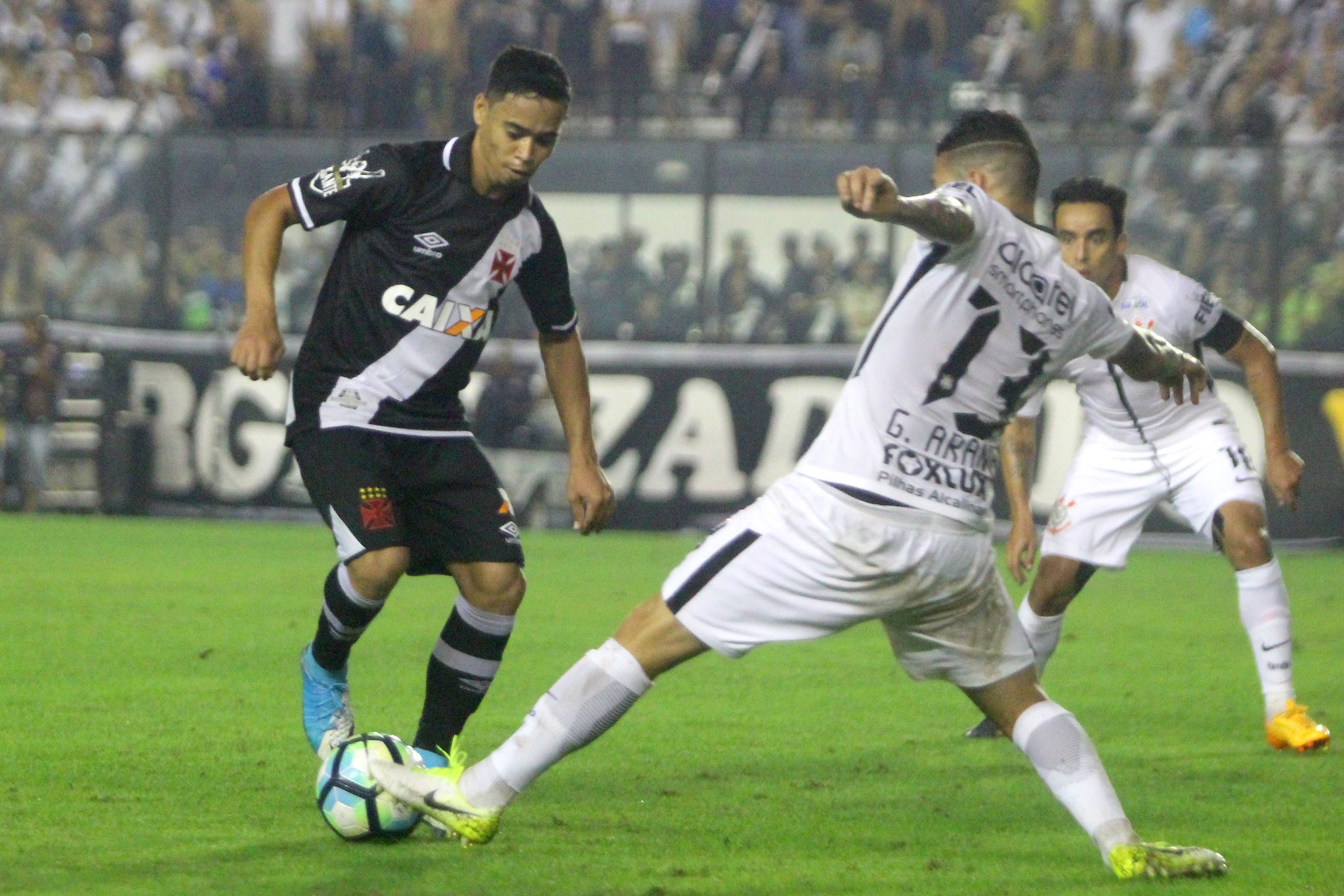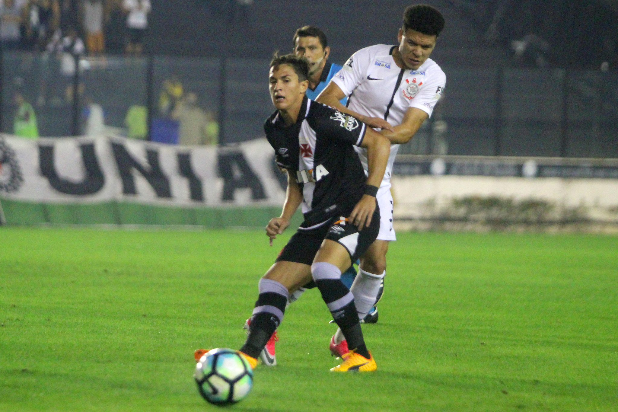 O jogo mal havia começado e o Vasco levou dois baques em sequência. Na primeira disputa de bola que teve, Kelvin caiu de mal jeito e torceu o joelho esquerdo, sendo substituído por Manga Escobar. Antes que o colombiano entrasse, porém, o Timão soube capitalizar a superioridade numérica: bela troca de passes, que começou com Jadson na direita e terminou com Guilherme Arana recebendo de Clayson. O lateral cruzou rasteiro e achou Marquinhos Gabriel livre para abrir o placar.