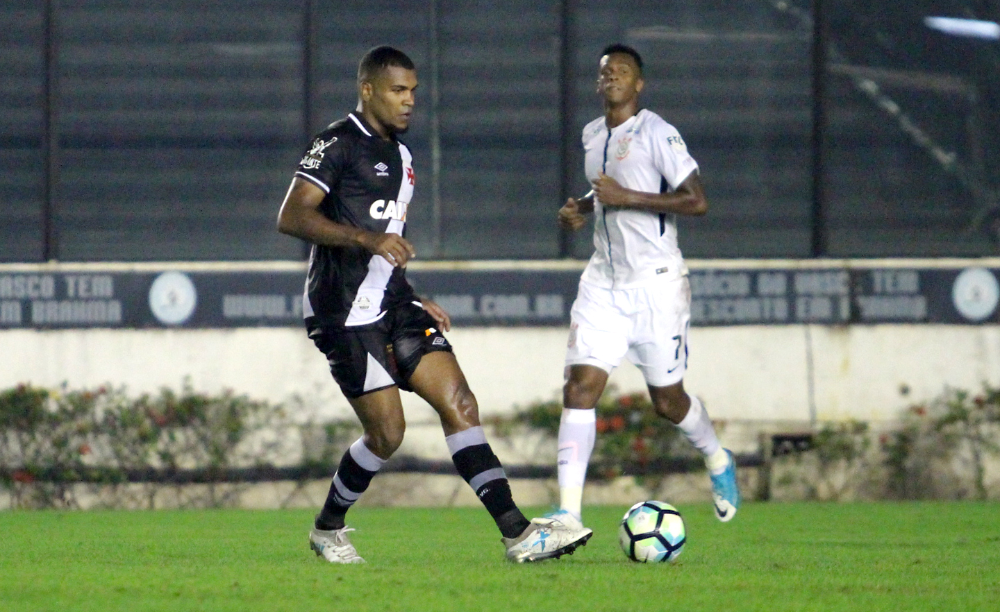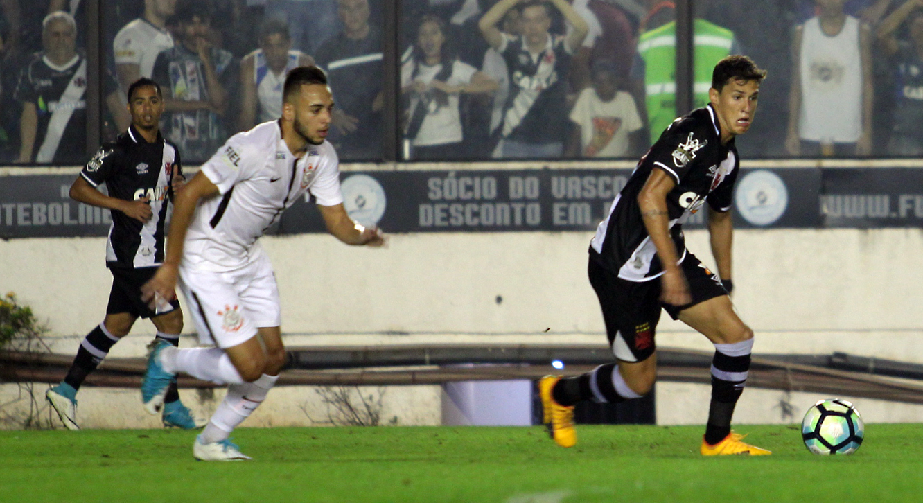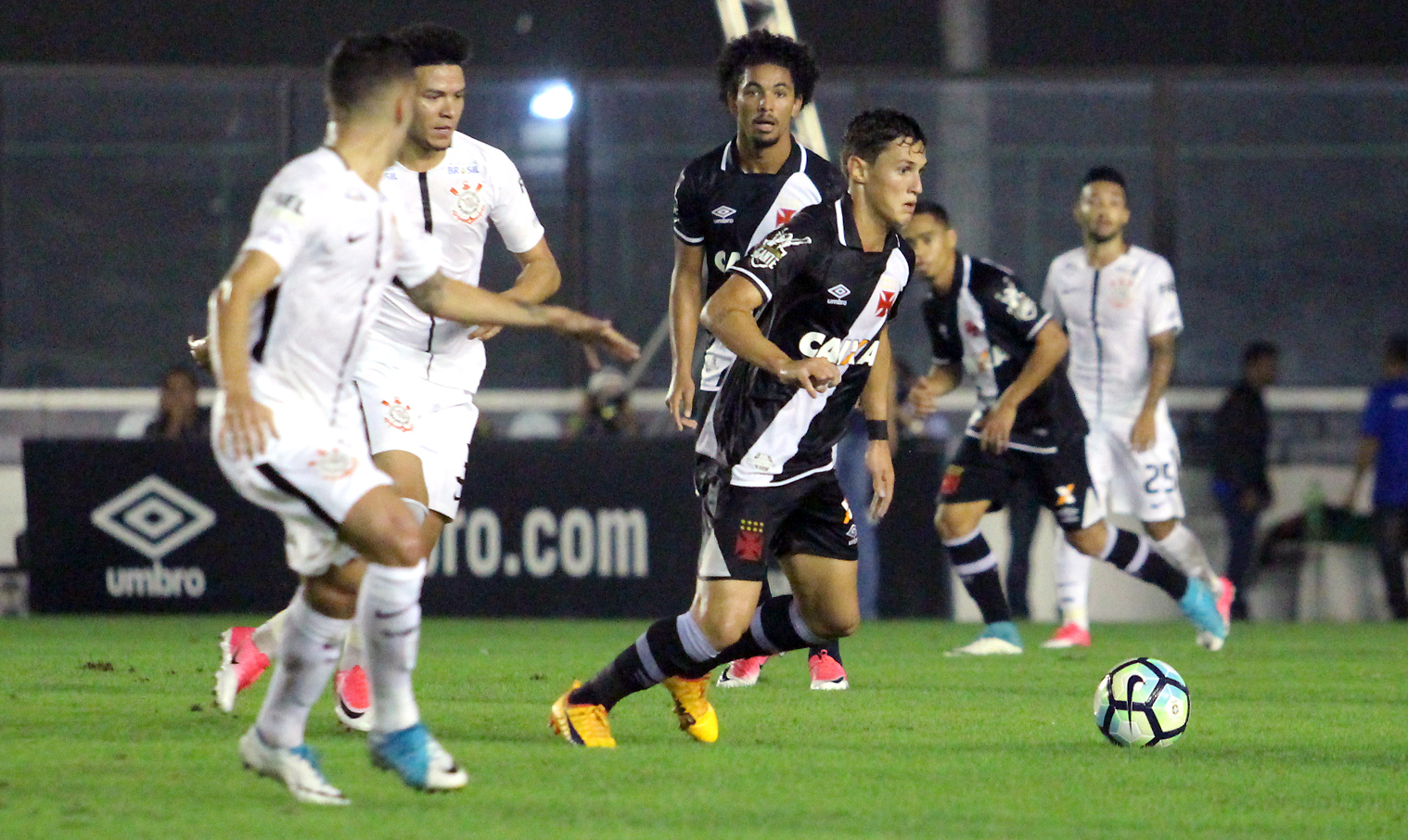 O jogo mal havia começado e o Vasco levou dois baques em sequência. Na primeira disputa de bola que teve, Kelvin caiu de mal jeito e torceu o joelho esquerdo, sendo substituído por Manga Escobar. Antes que o colombiano entrasse, porém, o Timão soube capitalizar a superioridade numérica: bela troca de passes, que começou com Jadson na direita e terminou com Guilherme Arana recebendo de Clayson. O lateral cruzou rasteiro e achou Marquinhos Gabriel livre para abrir o placar.