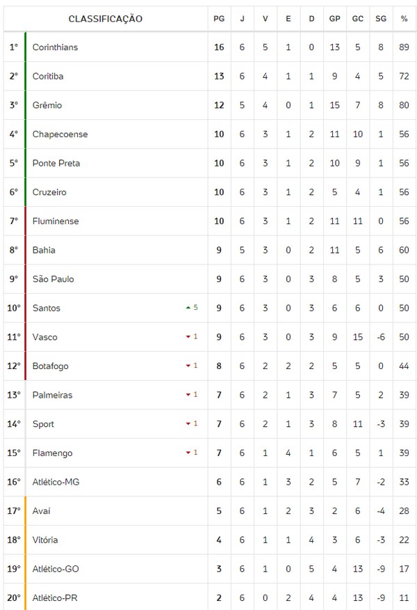 Pela sexta rodada do Campeonato Brasileiro, o Vasco, que venceu o Sport por 2 a 1 em São Januário, está na 11ª posição após os jogos deste domingo. Com 9 pontos, o Gigante da Colina está a 1 ponto da zona de classificação para a Libertadores.