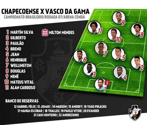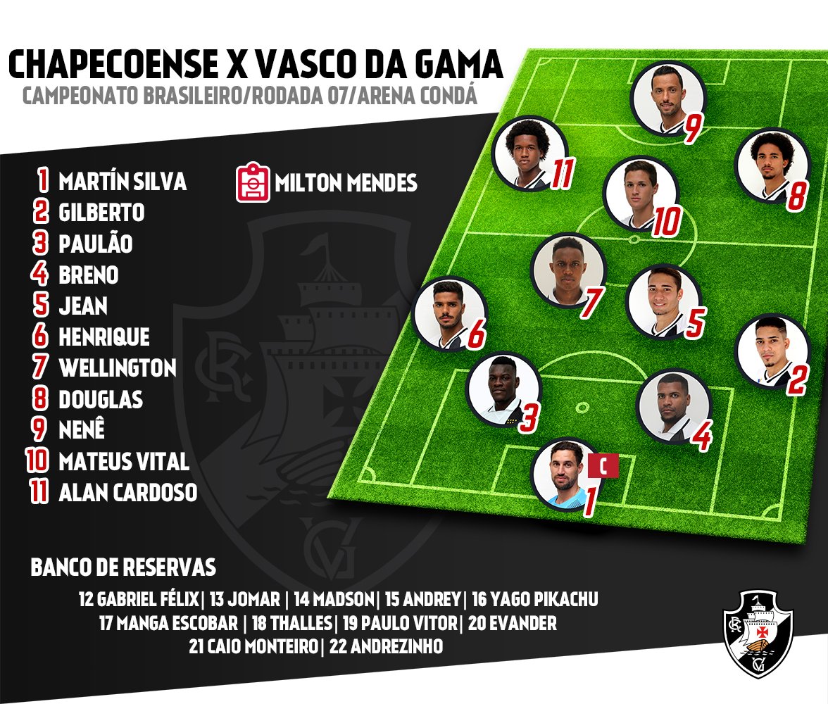 Vasco confirmado: Martín, Gilberto, Breno, Paulão e Henrique; Jean, Wellington, Douglas, Mateus Vital e Alan; Nenê. #gevas