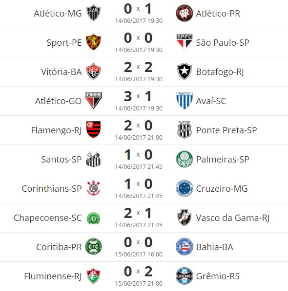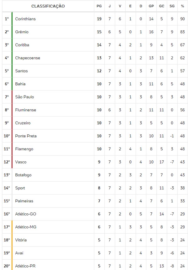 Terminada a 7ª rodada do Brasileiro 2017, o Vasco, que perdeu para a Chapecoense por 2 a 1, caiu da 11ª para a 12ª posição na tabela.