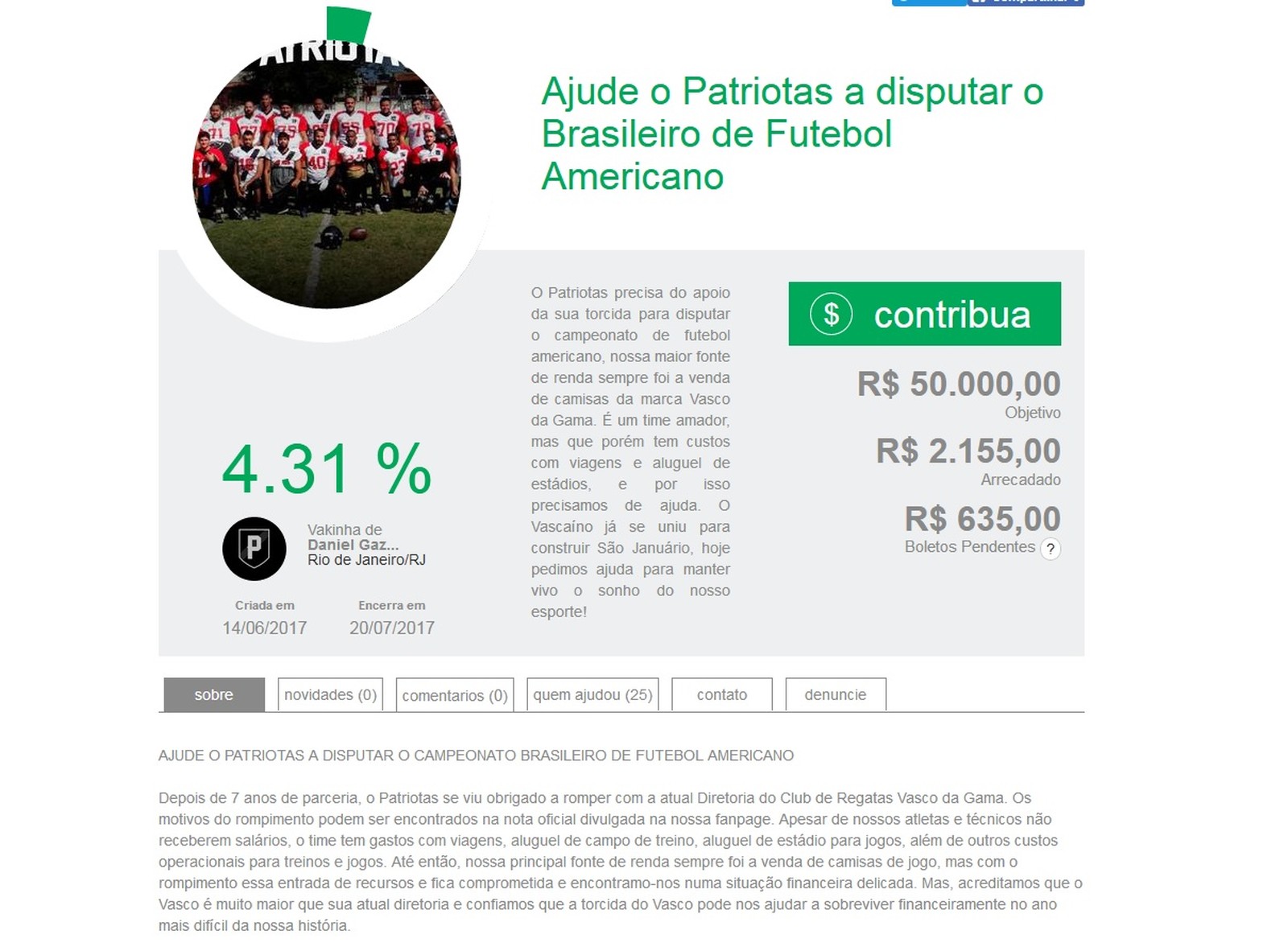 - Somos um time amador, mas que tem custos com viagens e aluguel de estádios, e por isso precisa de ajuda. O vascaíno já se uniu para construir São Januário, hoje pedimos ajuda para manter vivo o sonho do nosso esporte - escreveu o Patriotas FA no site onde está sendo realizada a vaquinha virtual (