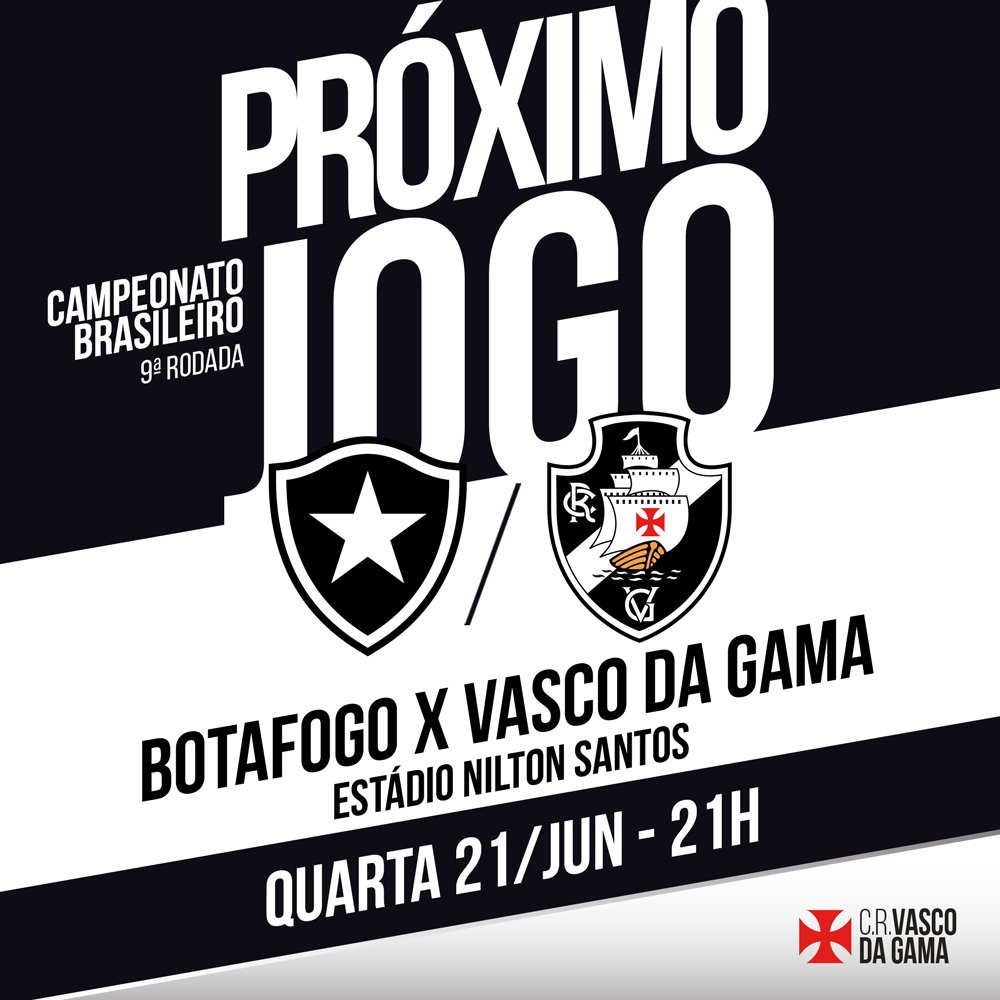 É clássico! Na próxima quarta-feira, o Vasco encara o Botafogo no Estádio Nilton Santos. Vamos em busca de mais uma vitória no Brasileirão!