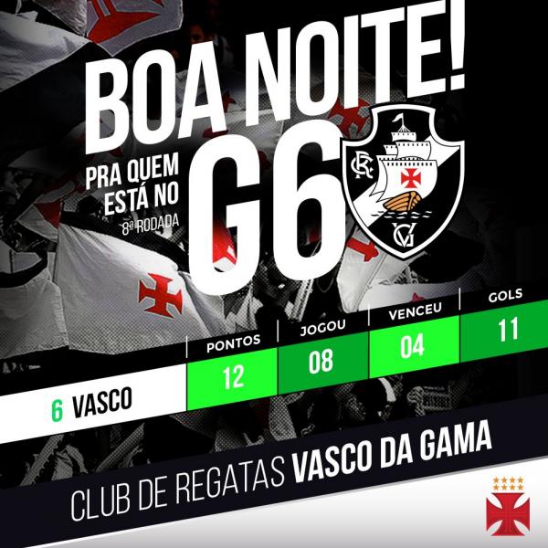 Vasco celebra G6 em rede social: 'Vamos crescendo a cada rodada'