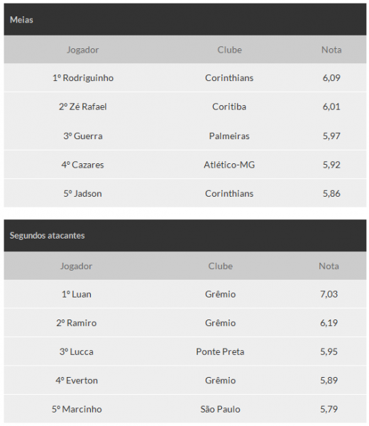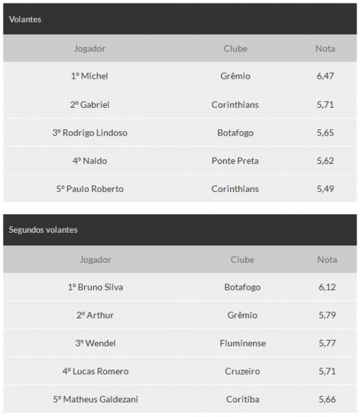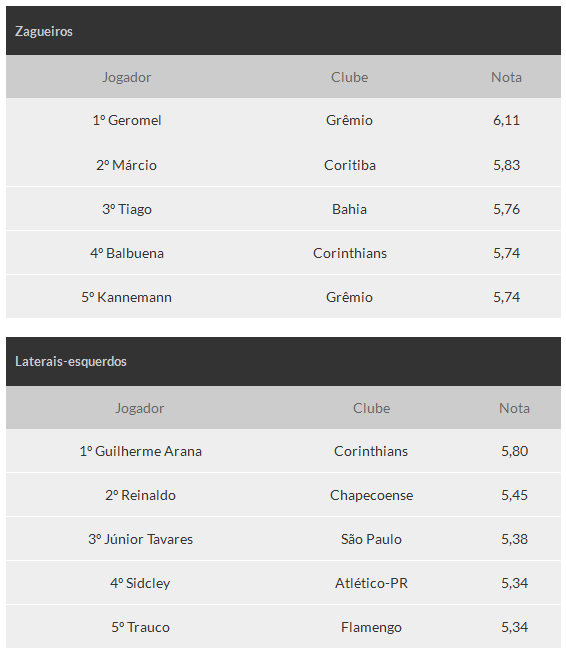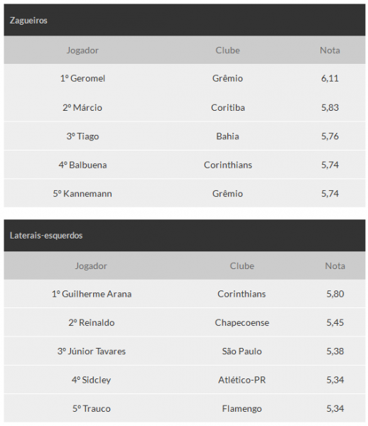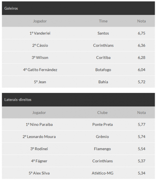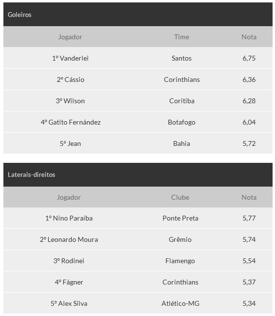 Na lateral direita, Nino Paraíba, da Ponte Preta, segue como o primeiro colocado, sendo o único jogador na liderança de uma posição desde a 1ª rodada. E isso que o jogador da não atuou na última partida, contra o Santos.