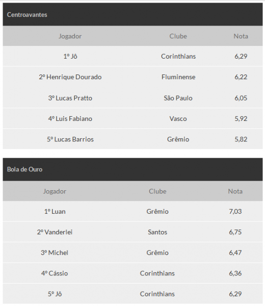 O Corinthians, líder do Brasileirão, que estava com cinco jogadores na seleção da Bola de Prata na 7ª rodada, agora conta com três: o lateral-esquerdo Guilherme Arana, o meia Rodriguinho e o centroavante Jô. O goleiro Cássio, que foi bem no jogo contra o Coritiba, pulou para a segunda colocação, que tem ainda como líder o santista Vanderlei.