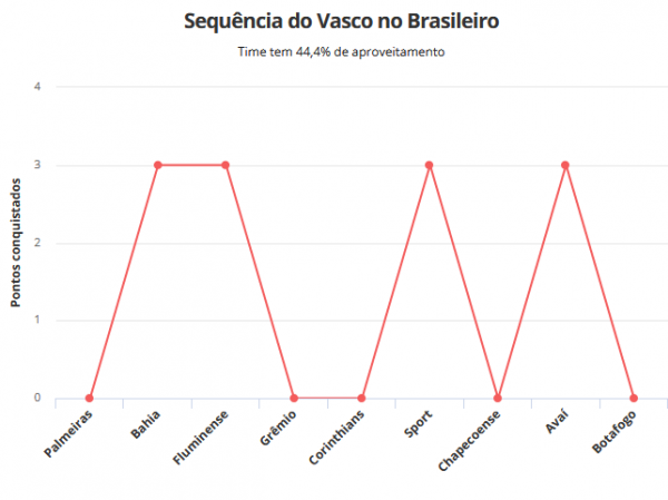As viagens, entretanto, foram duras: contra Palmeiras e Grêmio, dois candidatos ao título, e Chapecoense, sempre difícil na Arena Condá. No próximo domingo, oportunidade de ouro para se levantar do revés desta quarta: pega o Atlético-GO em São Januário.