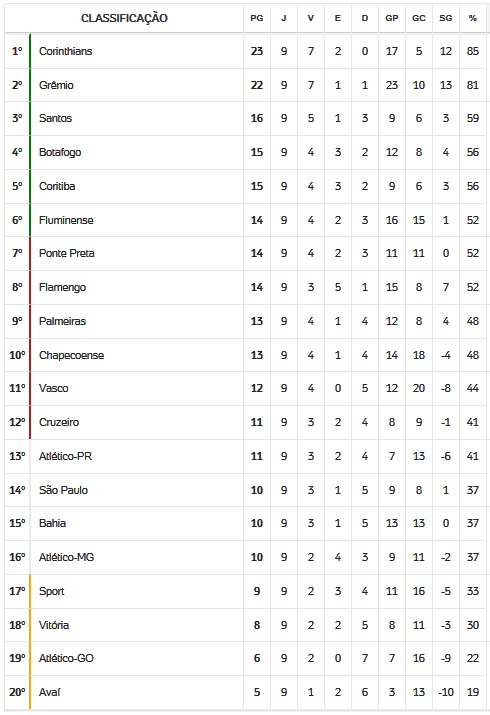 Terminada a 9ª rodada do Brasileiro 2017, o Vasco, que perdeu para o Botafogo por 3 a 1, caiu da 6ª para a 11ª posição na tabela.