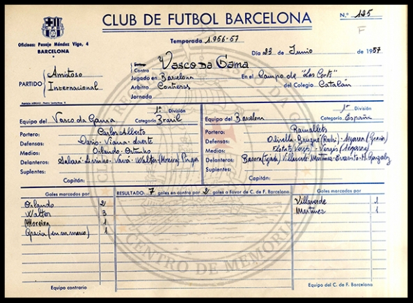 Há 60 anos, no dia 23 de junho de 1957, o Vasco aplicava uma das maiores goleadas internacionais já sofridas pelo Futbol Club Barcelona em sua história. Para o desespero dos barcelonistas, com três gols de Laerte, dois de Vavá, um de Válter e outro de Wilson Moreira, o Gigante da Colina aplicou um verdadeiro chocolate na Catalunha e venceu os culés por 7 a 2, em pleno Les Cortes, a casa do Barcelona antes do Camp Nou.