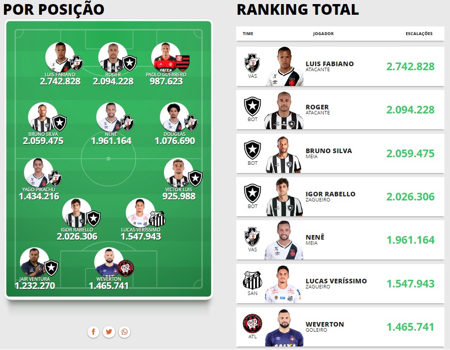 Luis Fabiano liderou o ranking dos "mais escalados" da vez e, por muito pouco, não superou a marca de Jô, que até então, é o recordista. Enquanto o vascaíno foi a opção de 2.742.828 cartoleiros nesta rodada, o corintiano foi a de 2.744.917 na estreia de 2017.
