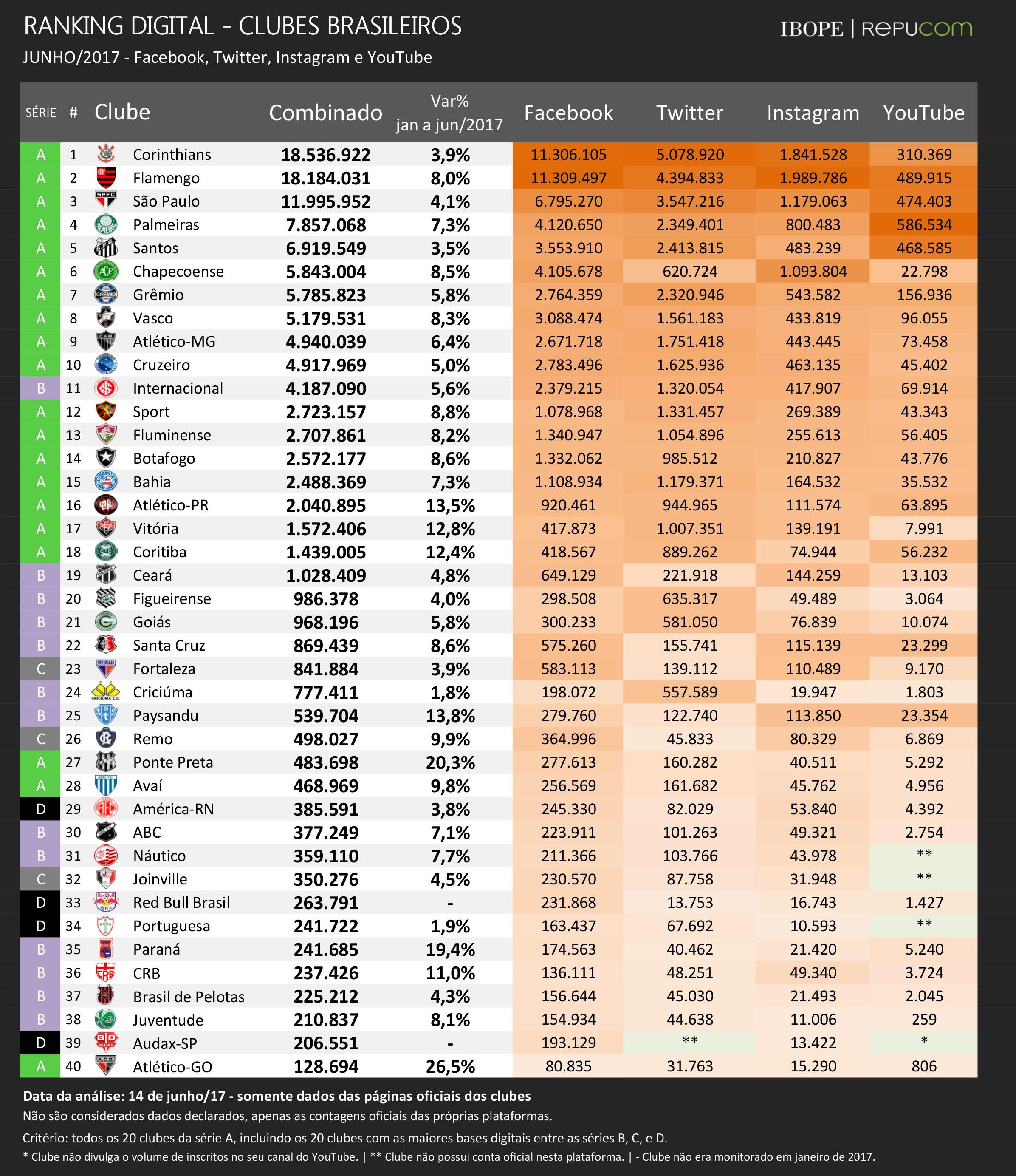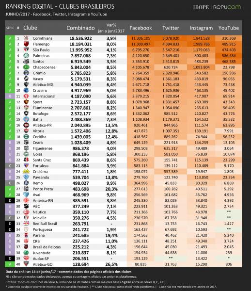 O levantamento é divulgado mensalmente pelo IBOPE Repucom e tem o objetivo de acompanhar o desenvolvimento das bases digitais dos 40 clubes com o maior número de seguidores do país.
