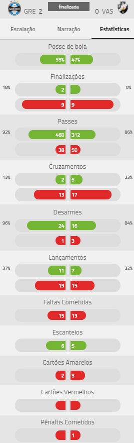 Confira estatísticas de Grêmio 2 x 0 Vasco
