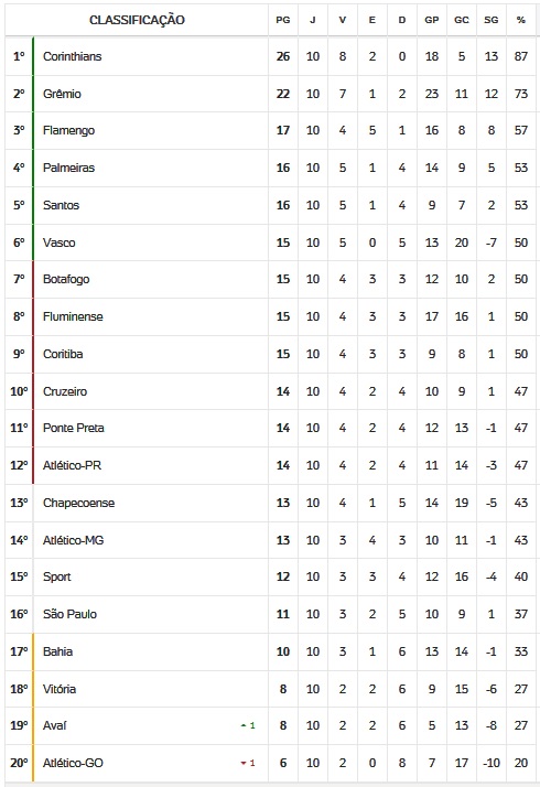 Terminada a 10ª rodada do Brasileiro 2017, o Vasco, que venceu o Atlético-GO por 1 a 0, subiu da 11ª para a 6ª posição na tabela, voltando ao G6.