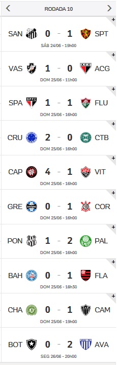 VASCO TERMINA A 10ª RODADA DO BRASILEIRO NO G6, EM 6º LUGAR