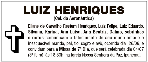 Missa de 7º dia do grande benemérito Luiz Henriques será nesta 3ª-feira às 18h30