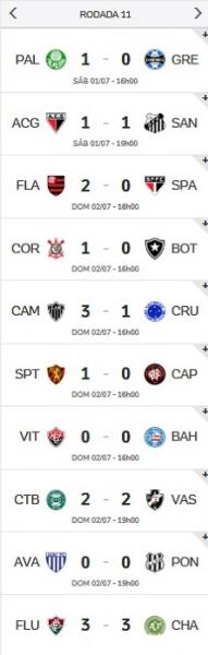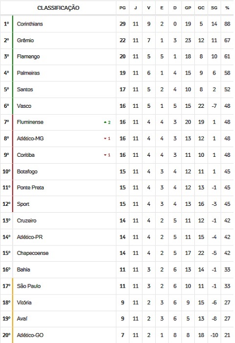 Terminada a 11ª rodada do Brasileiro, o Vasco, que empatou com o Coritiba por 2 a 2, se manteve na 6ª colocação e, portanto, dentro do G6.