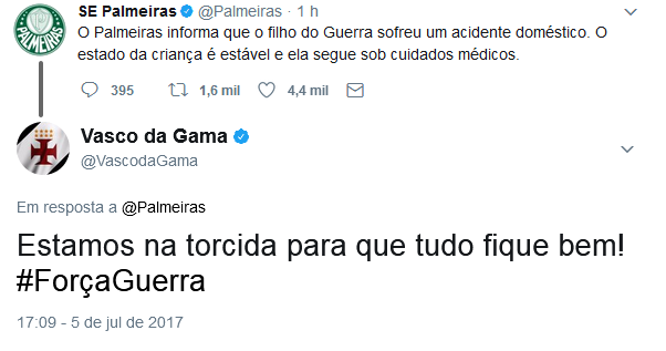 Em rede social, Vasco deseja 'força' ao palmeirense Guerra, cujo filho está internado
