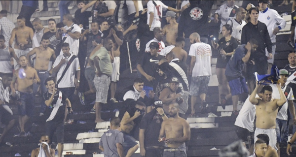 E, então, o jogo que era disputado e conturbado dentro de campo – cartões e entradas mais duras – viu a violência ser refletida nas arquibancadas. Um gol marcado e anulado pela arbitragem no início do segundo tempo foi a senha: a torcida cruzmaltina se revoltou. Um vascaíno pulou o vidro que separa o campo da torcida, entrou no gramado e só foi parado pela Polícia Militar.