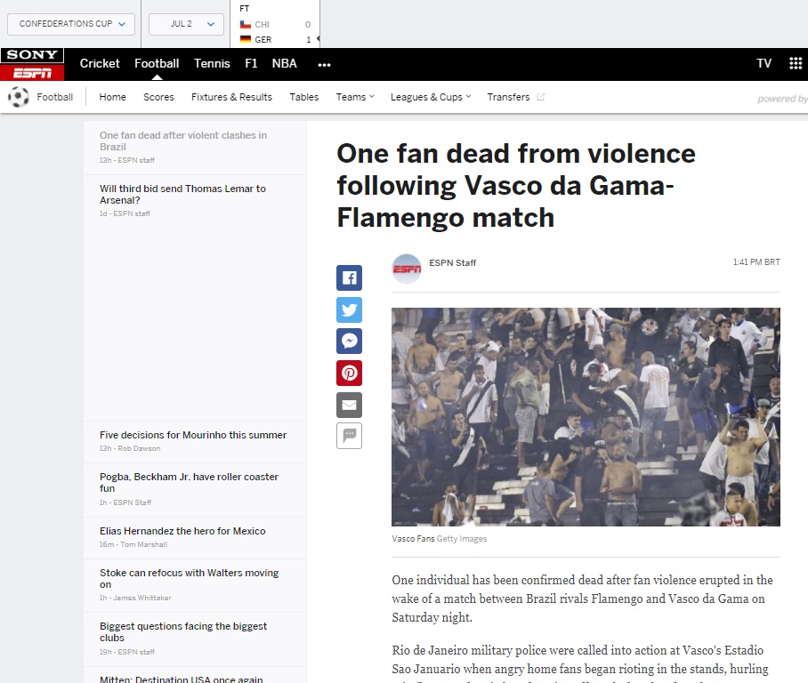 Imprensa internacional repercute morte de torcedor vascaíno após clássico em São Januário