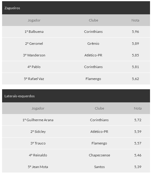 Apenas o zagueiro Pablo, que hoje é o 4º colocado entre os zagueiros, não está na seleção, entre os defensores do Corinthians, que é o time menos vazado da competição – sofreu apenas 5 gols em 12 jogos.