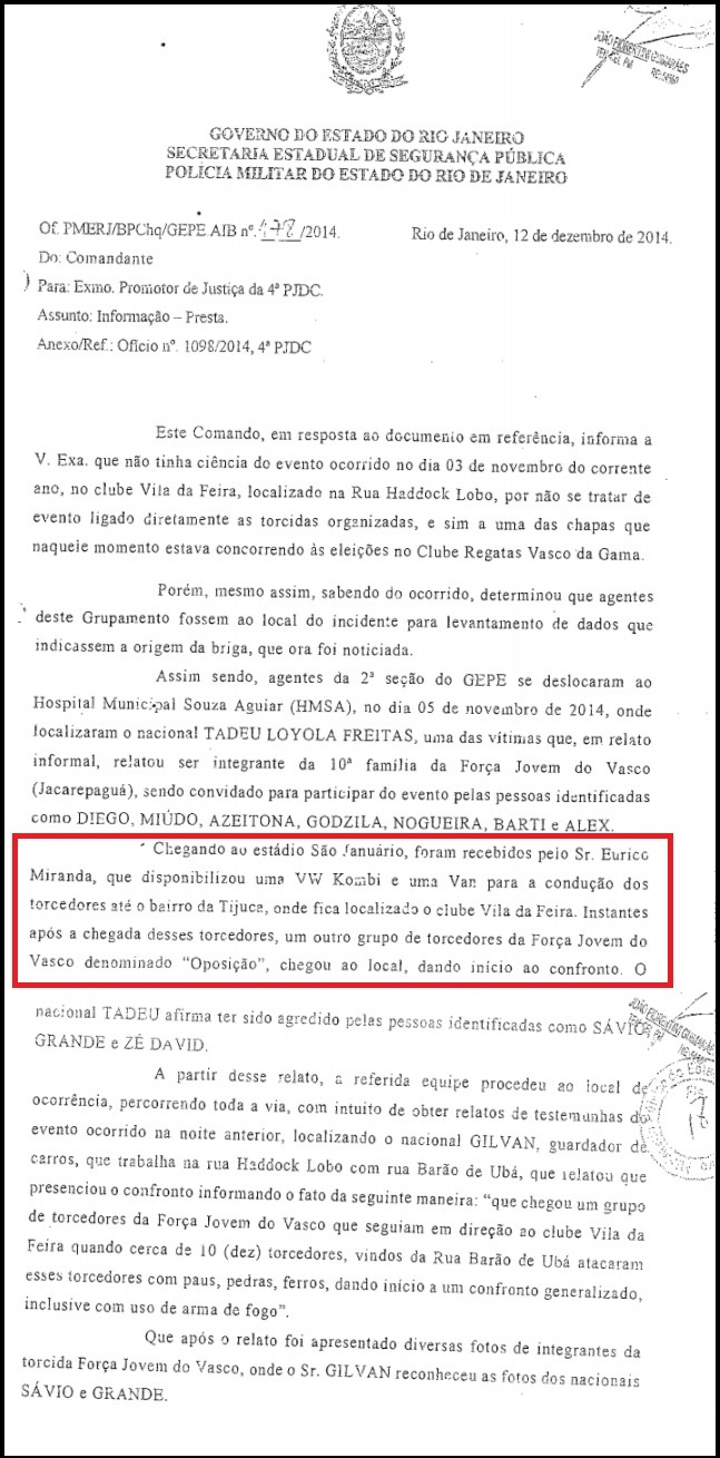 "Chegando ao estádio, foram recebidos pelo senhor Eurico Miranda, que disponibilizou uma VW Kombi e uma van para a condução dos torcedores até o bairro da Tijuca. Instantes após a chegada desses torcedores, um outro grupo da Força Jovem denominado 'oposição' chegou ao local, dando início ao confronto", diz trecho do documento juntado aos autos, pela Secretaria de Segurança Pública do Rio de Janeiro.