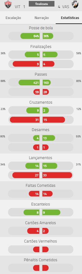 Confira estatísticas de Vitória 1 x 4 Vasco