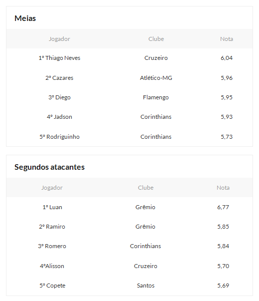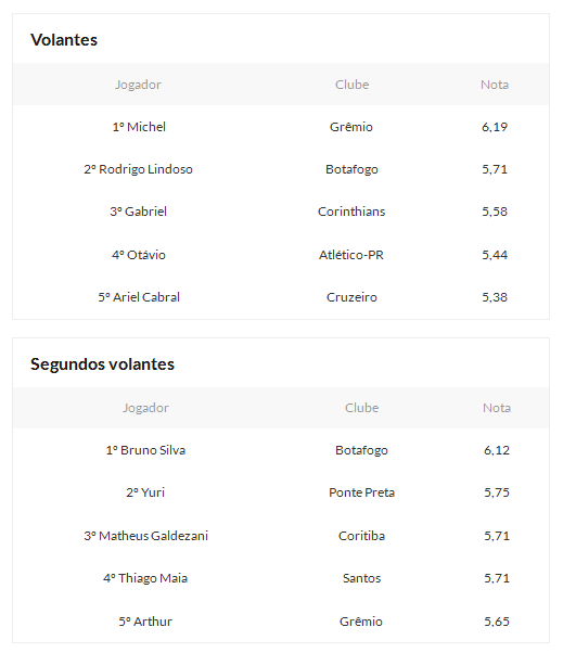 Já entre os jogadores do Grêmio, o segundo atacante Luan, que marcou o gol da vitória contra o Flamengo, segue como o líder na posição e como o segundo melhor jogador do campeonato. Vencedor em 2015, Luan continua firme como favorito ao prêmio novamente esse ano, assim como o seu companheiro de time, o zagueiro Geromel, vencedor da Bola de Prata em 2015 e 2016 e hoje o segundo melhor zagueiro do Brasileirão. Outro gremista que está na seleção do campeonato até aqui é o volante Michel.