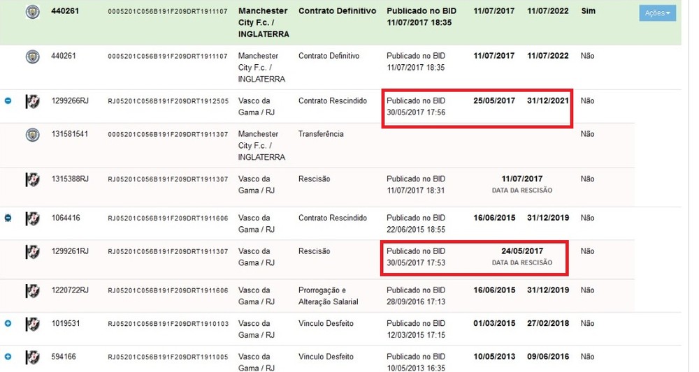 Antes de acertar com o Manchester City, no dia 11 de julho, Douglas rescindiu seu contrato com o Vasco em 24 de junho e assinou um novo vínculo no dia seguinte, com multa rescisória e vínculo maiores que o contrato anterior, e entrou em campo contra o Tricolor no dia 27. Porém, as duas atualizações só foram publicados no Boletim Informativo Diário da CBF (BID) no dia 30, conforme é possível ver na imagem acima.