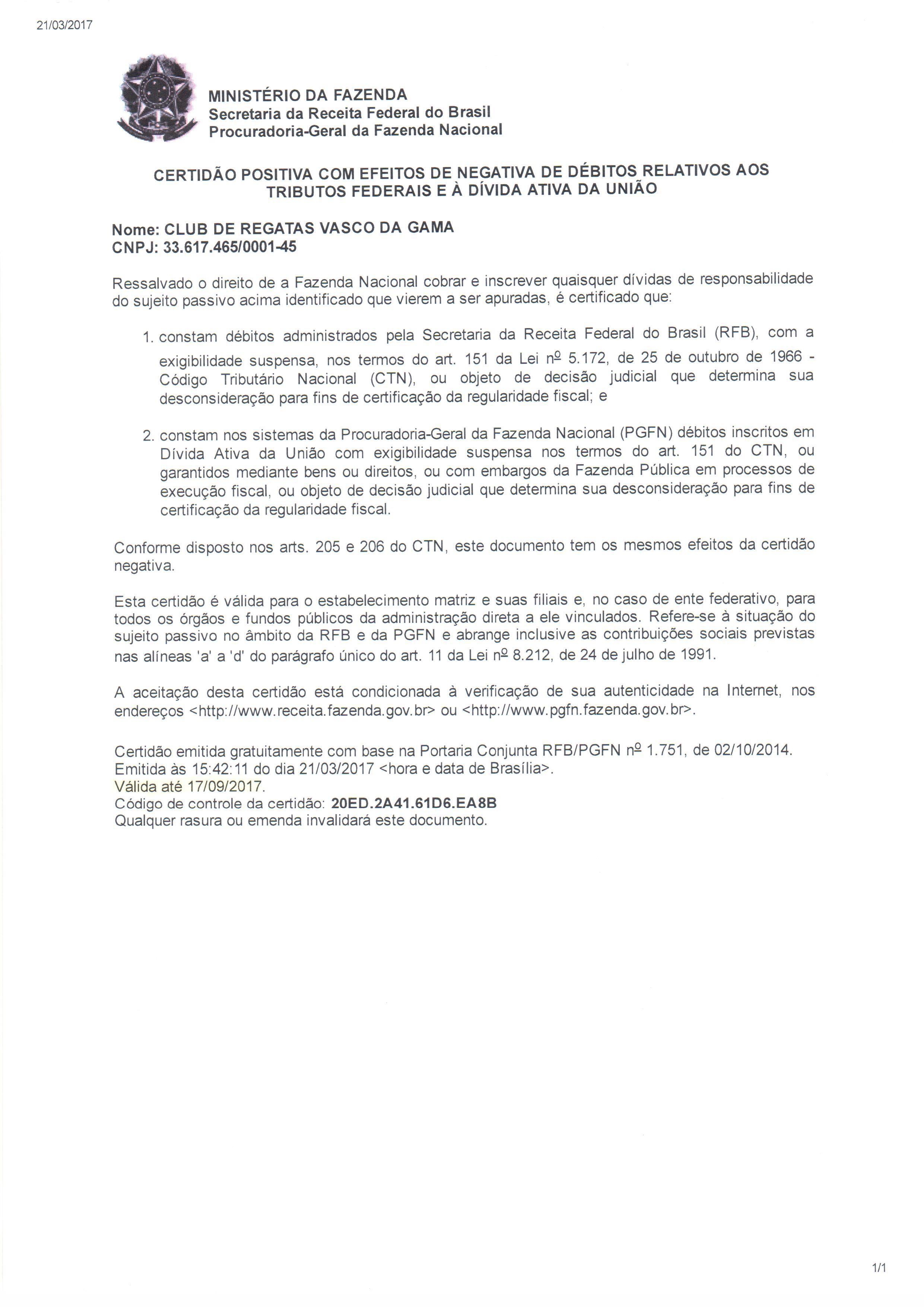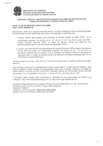 O Vasco inicia mais um semestre com todas as certidões necessárias para os programas de captação de recursos e patrocínio estatal, além da garantia dos programas de regularização fiscal. Além disso, o Vasco está em dia com o salário dos funcionários.