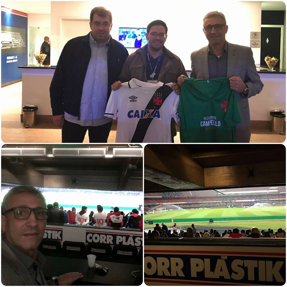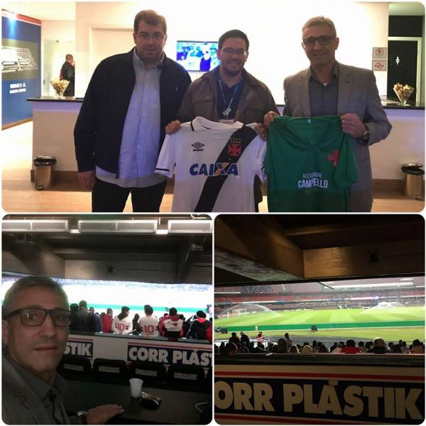 Alexandre Campello aproveitou a visita do Vasco ao Morumbi para torcer pelo time e estreitar relações com a Corr Plástik, renomada empresa de tubos e conexões que já atua no futebol. Ex-patrocinadora do Santos, a marca hoje estampa seu nome na manga da camisa do São Paulo. Abrir portas com os grandes empresários vem sendo uma das prioridades da Frente Vasco Livre!