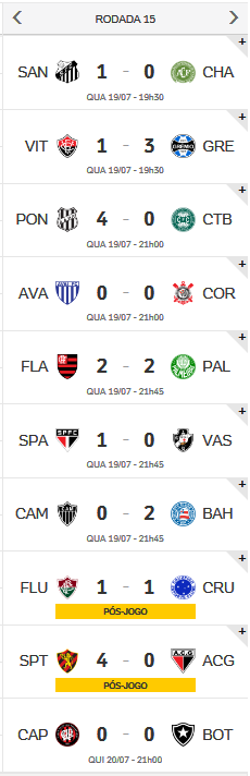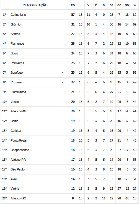 Terminada a 15ª rodada do Campeonato Brasileiro, o Vasco, que perdeu para o São Paulo por 1 a 0, caiu da 9ª para a 10ª colocação.