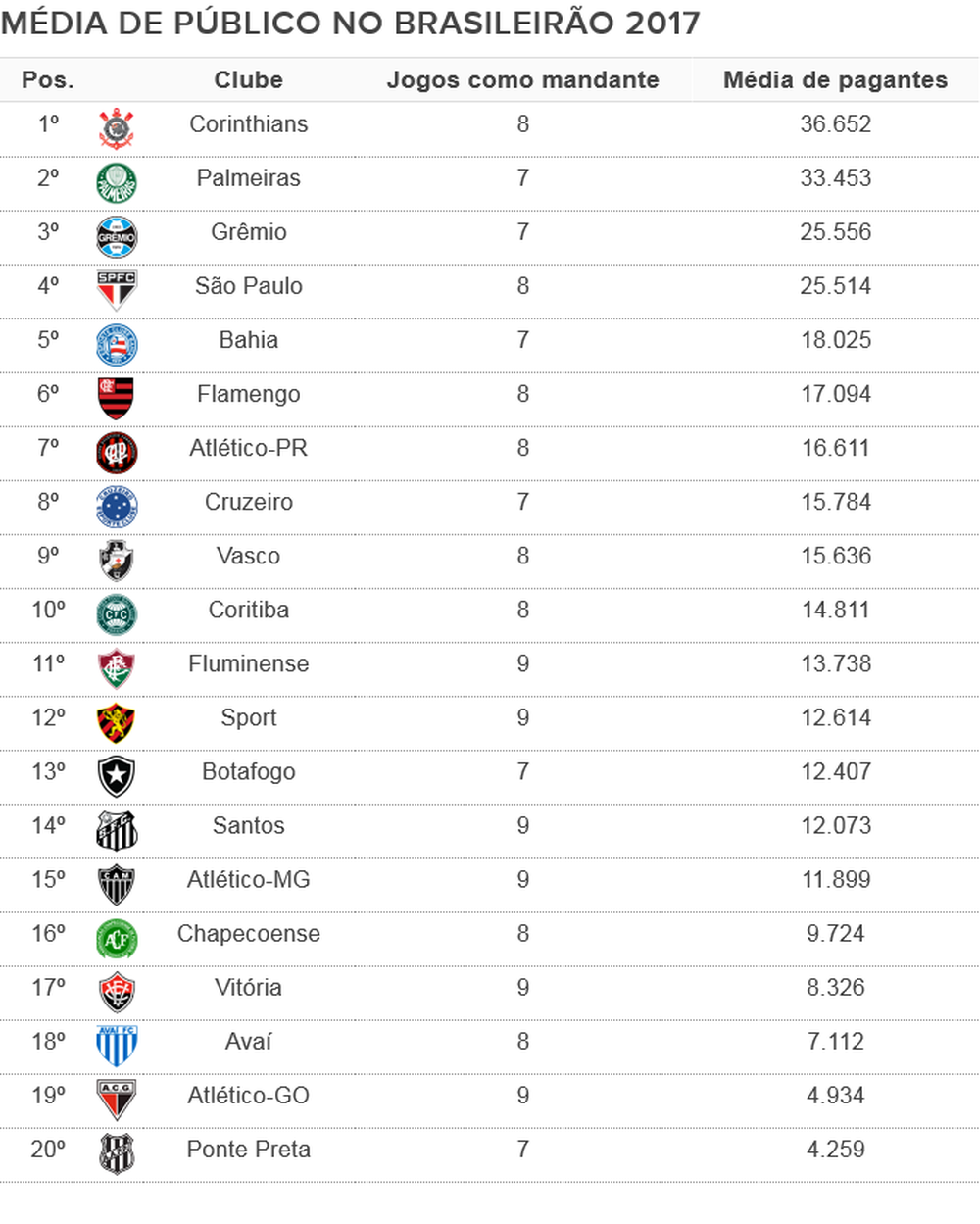Num campeonato em que a média de torcedores que pagam ingresso é de 15.524, o Timão e o Verdão são os únicos que conseguem dobrar este número, superando a marca dos 33 mil tickets vendidos. Lembrando que o levantamento feito pelo GloboEsporte.com é feito com base nos jogos dos 60 clubes das Séries A, B e C quando têm o mando de campo a favor. A surpresa fica por conta do Bahia (18.025), que era sexto, mas assumiu o quinto lugar ao ultrapassar o Flamengo (17.094), deixando o Rubro-Negro na sua antiga colocação.