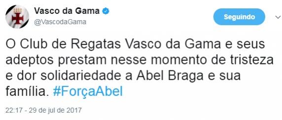 O Club de Regatas Vasco da Gama e seus adeptos prestam nesse momento de tristeza e dor solidariedade a Abel Braga e sua família. #ForçaAbel