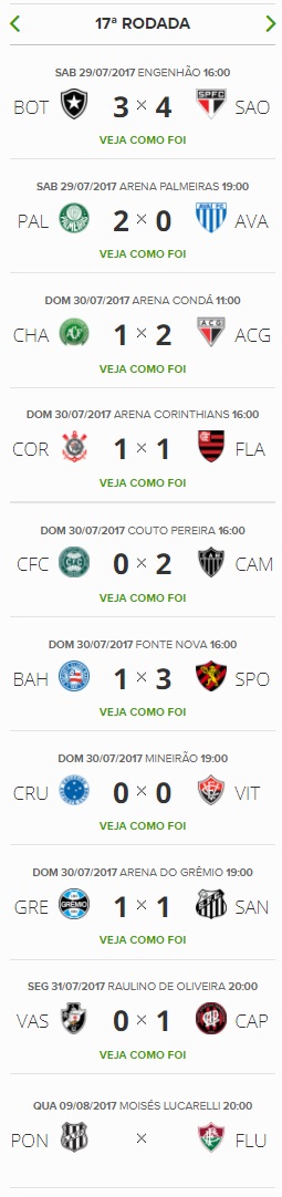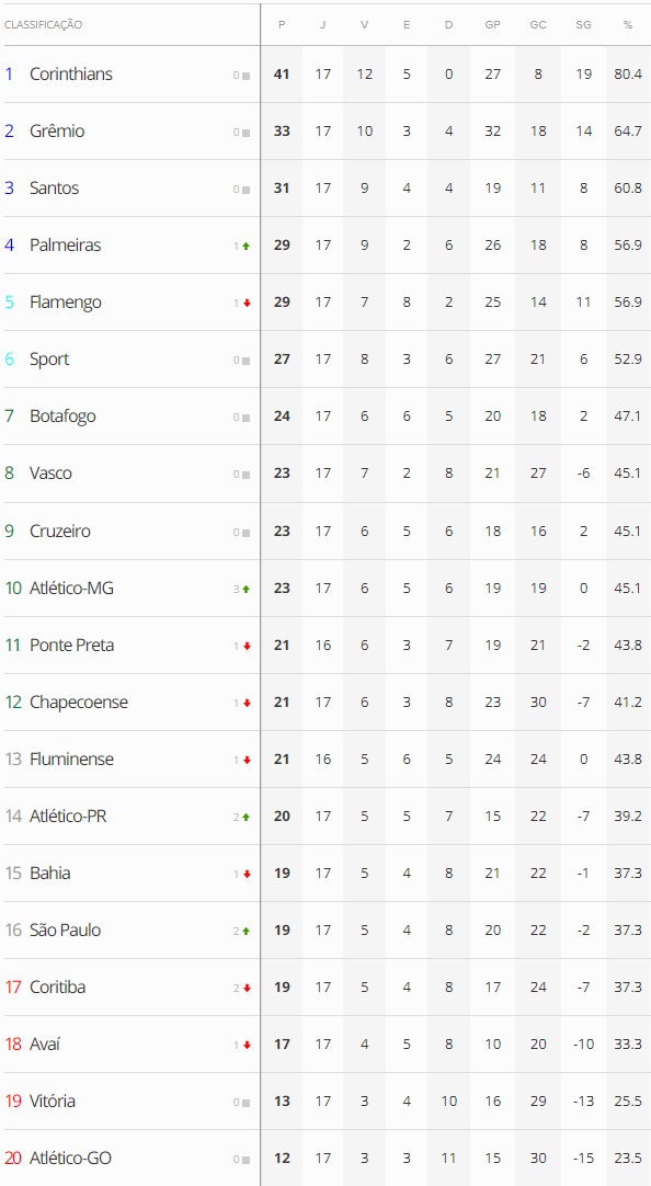 Faltando um jogo para o fim da 17ª rodada do Brasileiro, o Vasco segue em 8º lugar na tabela. A partida pendente é Ponte Preta x Fluminense, adiada para 9 de agosto. Ainda que o jogo tivesse sido realizado, o Gigante da Colina só terminaria a rodada em 9º lugar caso houvesse um vencedor na partida.