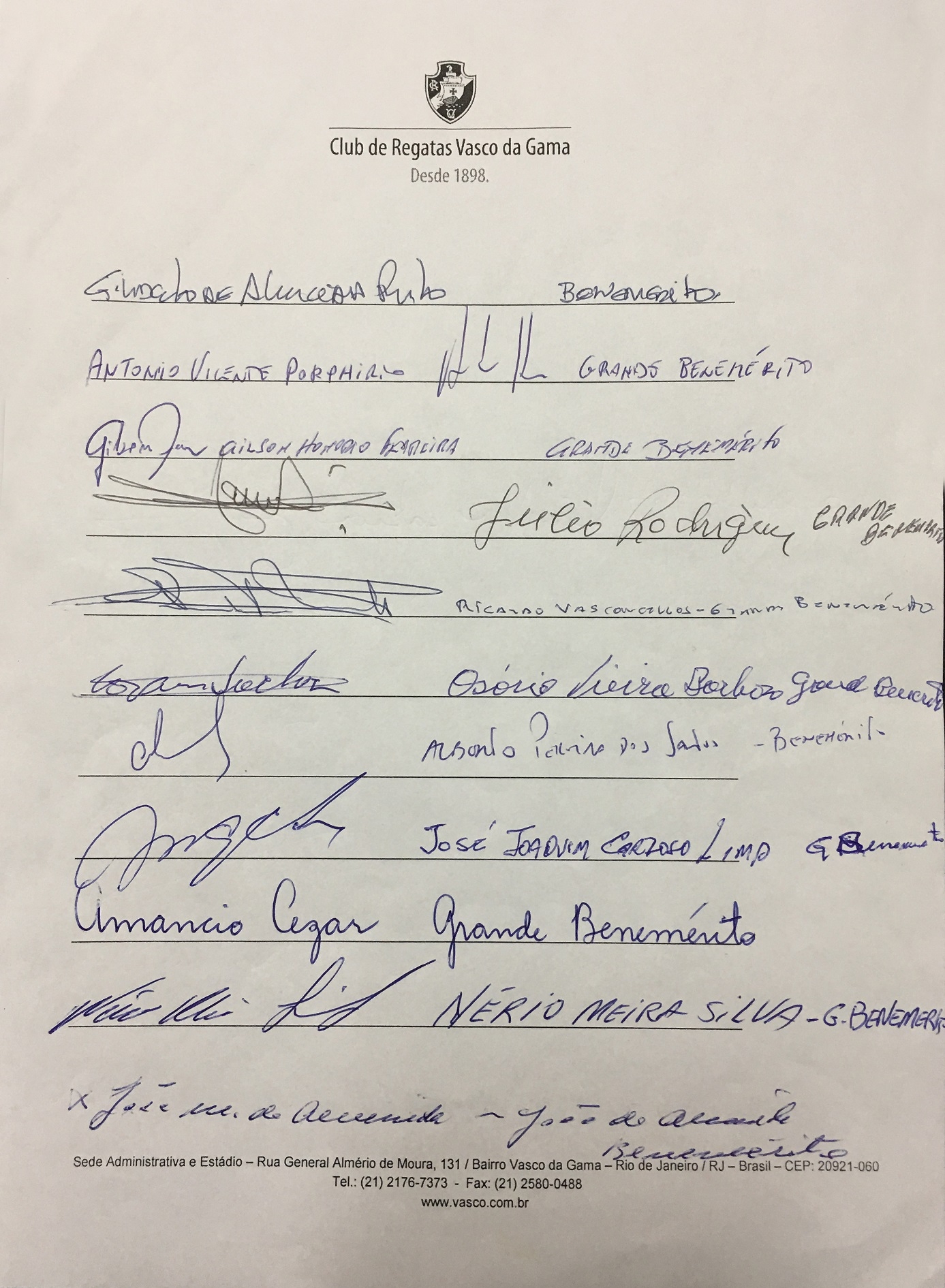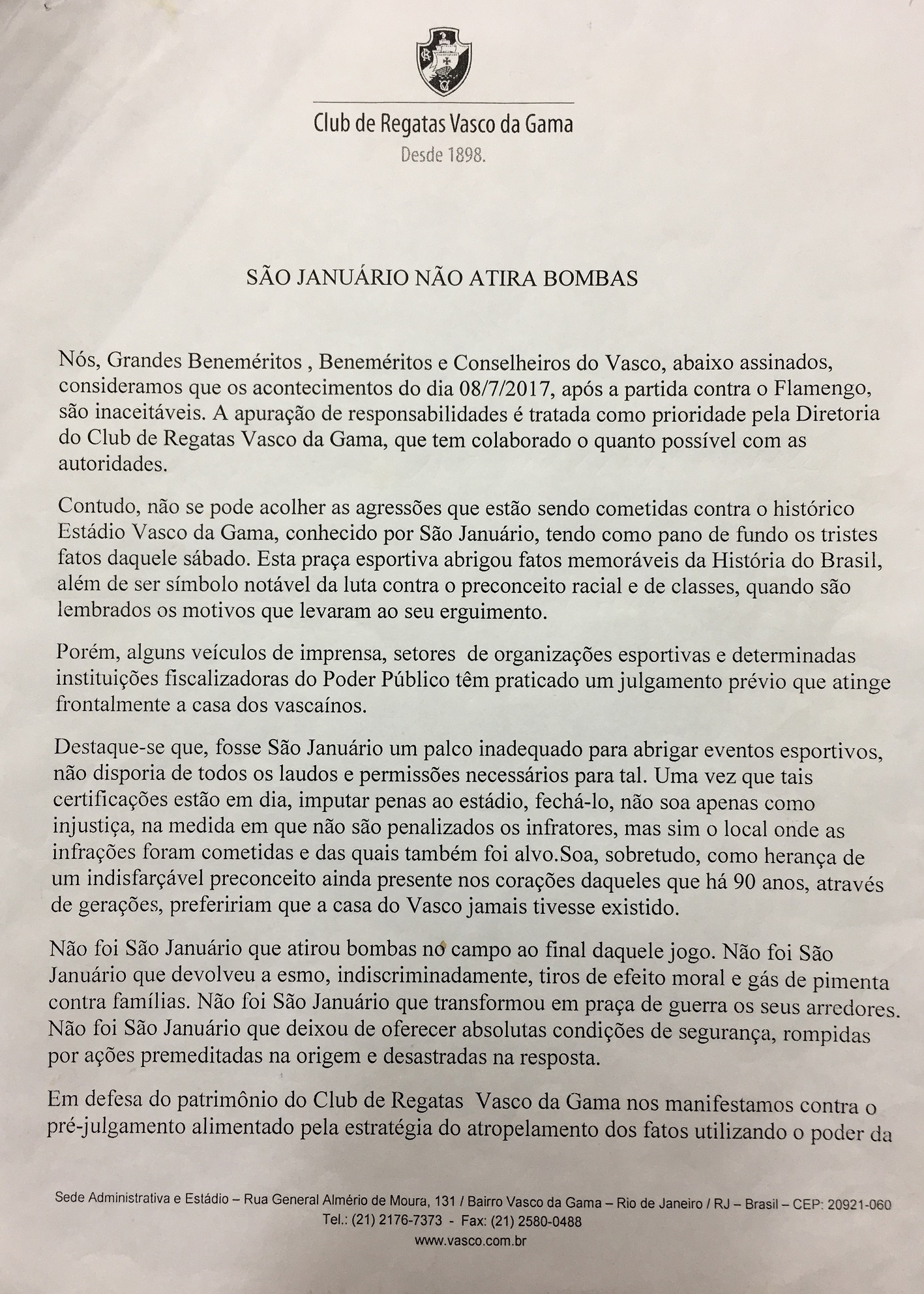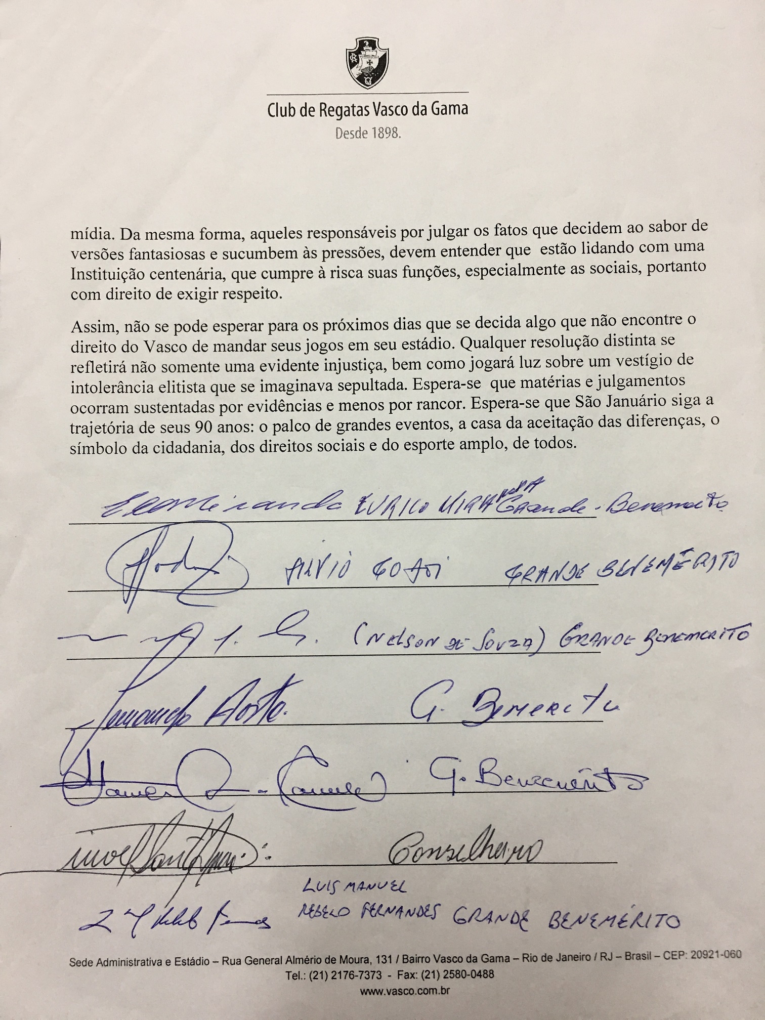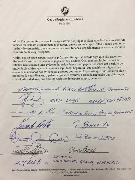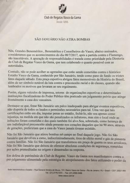 Grandes beneméritos, beneméritos e conselheiros do Vasco divulgam nota em defesa de São Januário; confira