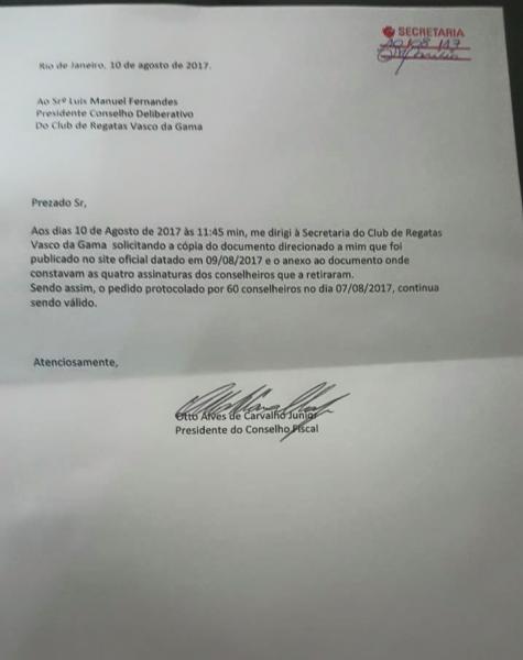 Em carta ao presidente do Conselho Deliberativo, Otto Carvalho diz que pedido protocolado por 60 conselheiros continua sendo válido