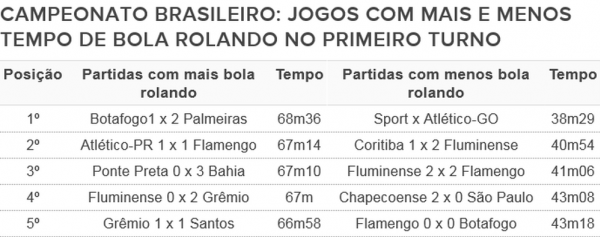 No Brasileirão, o tempo de jogo das 190 partidas realizadas até a metade do campeonato foi de 304h51m57s. No entanto, o período de bola rolando foi de 171h42m37, o que representa 56,3 % do total. Na média, cada confronto do primeiro turno teve 96m16 de duração, sendo que apenas 54m13 de disputa efetiva, incluindo já os acréscimos. Tal duração está quase seis minutos (5m47) abaixo dos 60 recomendados pela Fifa.
