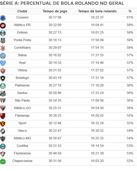 Se analisarmos o tempo de bola rolando como um todo nos 19 jogos de cada um dos 20 clubes da Série A, as partidas do Cruzeiro foram as que fluíram mais. Das 30h17 que duraram os confrontos da Raposa, em 18h22 não houve qualquer tipo de interrupção, o que corresponde a 61% do total. Na sequência aparecem Atlético-PR (30h32 / 18h04), Grêmio (30h27 / 18h01), Ponte (30h18 / 17h50) e Corinthians (30h29 / 17h54) , todos com 59%. Por outro lado, nos duelos de Coritiba (30h31 / 16h14), Fluminense (30h48 / 16h21) e Chapecoense (30h31 / 16h03) ao longo do primero turno, o período efetivo sem paralisações ficou restrito a 53%.