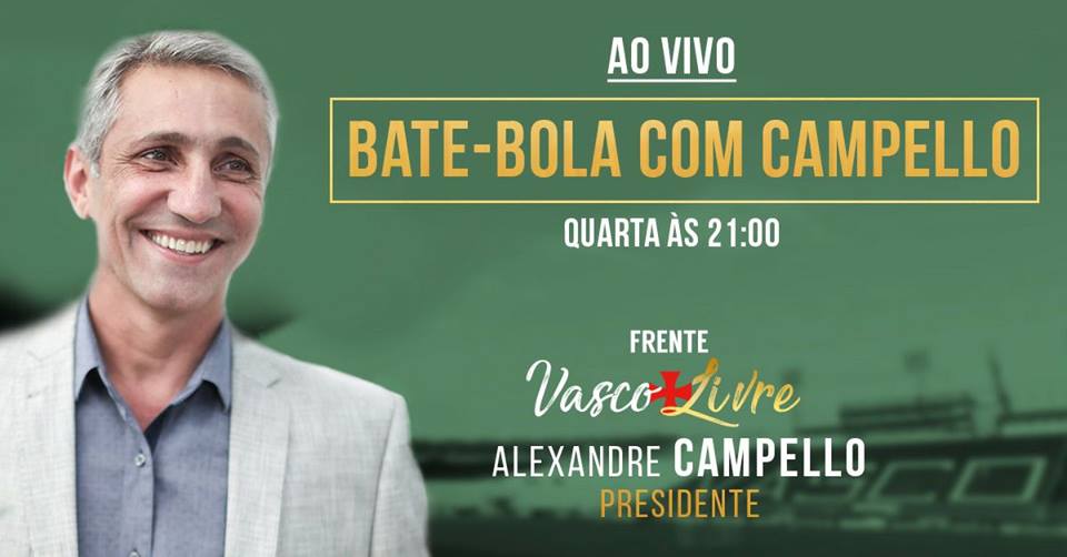 Se você, vascaíno, tem interesse em saber mais sobre a campanha de Alexandre Campello à presidência do Vasco, não perca o Live aqui na página da FVL que faremos nesta quarta-feira, dia 16, a partir das 21h. O candidato irá abordar alguns temas, responder perguntas e tirar dúvidas dos sócios e torcedores! Assista e participe!
