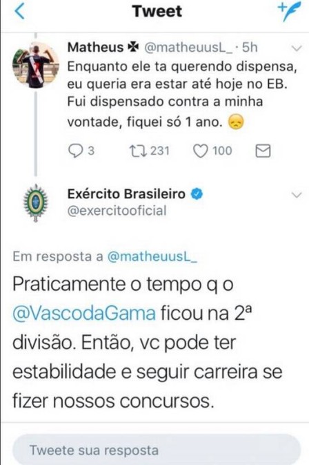"Praticamente o tempo que o @vascodagama ficou na 2ª Divisão. Então, você pode ter estabilidade e seguir carreira se fizer nossos concursos", respondeu a conta do Exército.