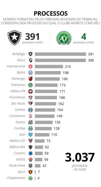 O Vasco é réu em 390 processos na Justiça do Trabalho e tem dívida trabalhista estimada em R$ 191 milhões. Os dados são do Tribunal Regional do Trabalho do Rio de Janeiro, referentes ao fim de 2016, e o valor do débito foi calculado de acordo com o último balanço financeiro do clube, também relacionado ao ano passado. Os números são parte de um levantamento do GloboEsporte.com, com todos os clubes da Série A, mais o Internacional (clique aqui e confira todos os dados).