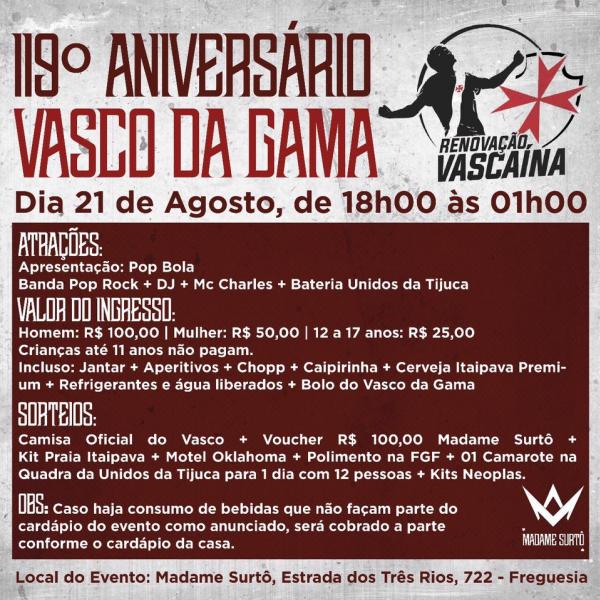 Renovação Vascaína promoverá evento nesta 2ª para comemorar os 119 anos do Vasco