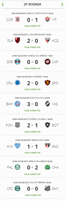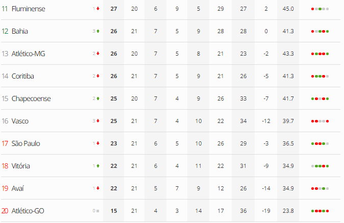 Terminados os jogos deste domingo pela 21ª rodada do Brasileiro, o Vasco, que perdeu para o Bahia por 3 a 0, caiu da 13ª para a 16ª posição na tabela.