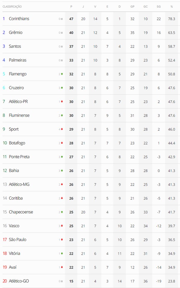 Terminados os jogos da 21ª rodada do Brasileiro, o Vasco, que perdeu para o Bahia por 3 a 0, caiu da 13ª para a 16ª posição na tabela.