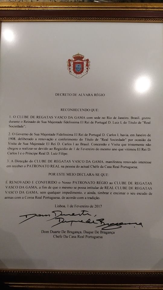 Com grande alegria nosso clube recebeu o título que lhe era devido desde 1908! Na sessão solene do Conselho Deliberativo, em comemoração ao aniversário do Vasco, foi entregue o alvará régio contendo o título de Real Club de Regatas Vasco da Gama, expedido que foi pela Casa Real Portuguesa, que nos foi entregue pelo Presidente da Associação Portuguesa dos Autarcas Monárquicos, Manuel Beninger, em mãos do Presidente Eurico Miranda! Viva o Vasco!