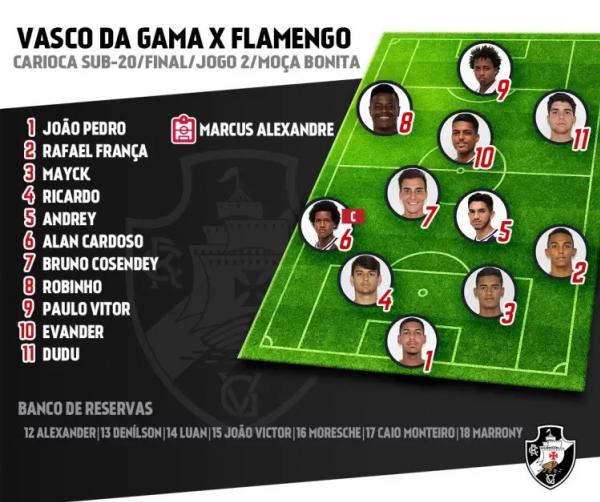 O Vasco vai de João Pedro, Rafael França, Mayck, Ricardo e Alan; Andrey, Cosendey, Dudu, Evander e Robinho; Paulo Vitor. #gevas