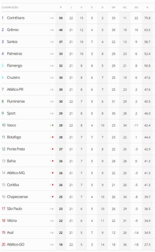 Terminados os jogos deste sábado pela 22ª rodada do Brasileiro, o Vasco, que venceu o Fluminense por 1 a 0, subiu da 16ª para a 10ª posição na tabela.